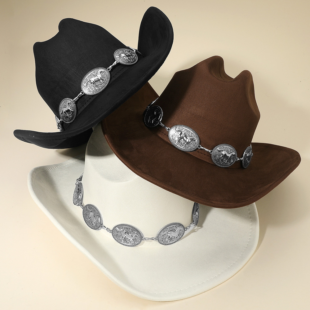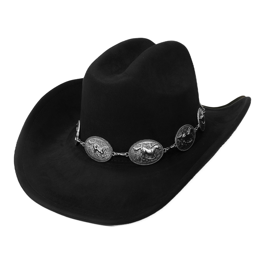 • Classic cowboy hat featuring an oval concho chain band with engraved rodeo-inspired details. Designed for rodeos, concerts, festivals, or everyday western wear, this bold hat brings authentic cowboy style with a durable design and striking concho accents for standout western fashion.