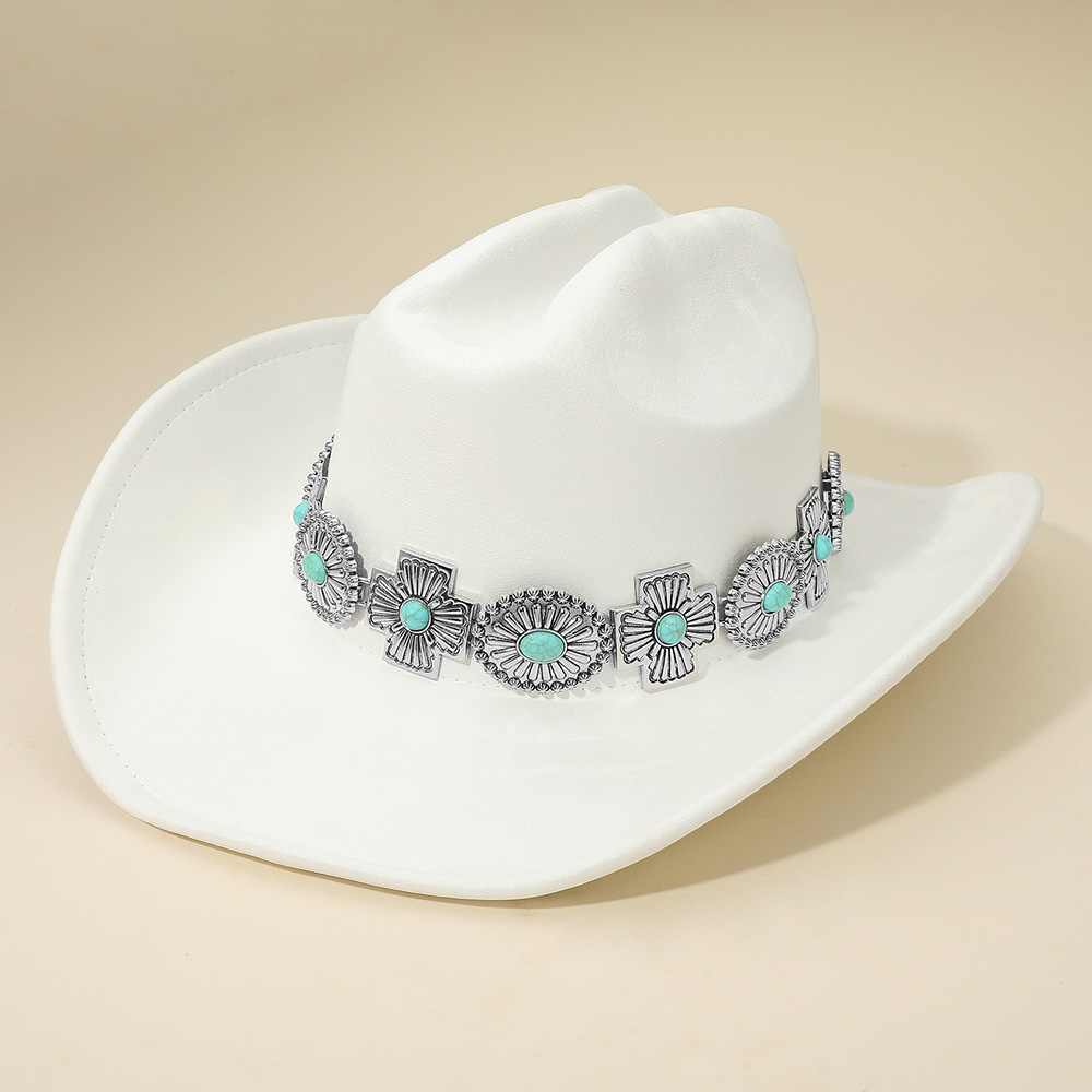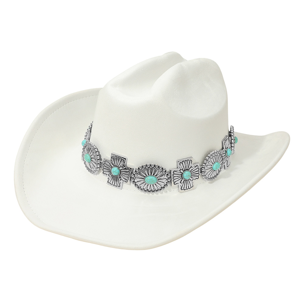 Details • Crown Circumference : 23" • Crown Height : 4.75" • Brim Height : 3.75" • Material : 100% Polyester • Classic western cowboy hat designed with a detailed concho band that adds bold character and unique flair. Perfect for festivals, rodeos, or casual style, this hat blends timeless tradition with standout fashion appeal, making it a versatile accessory for any western-inspired look.
