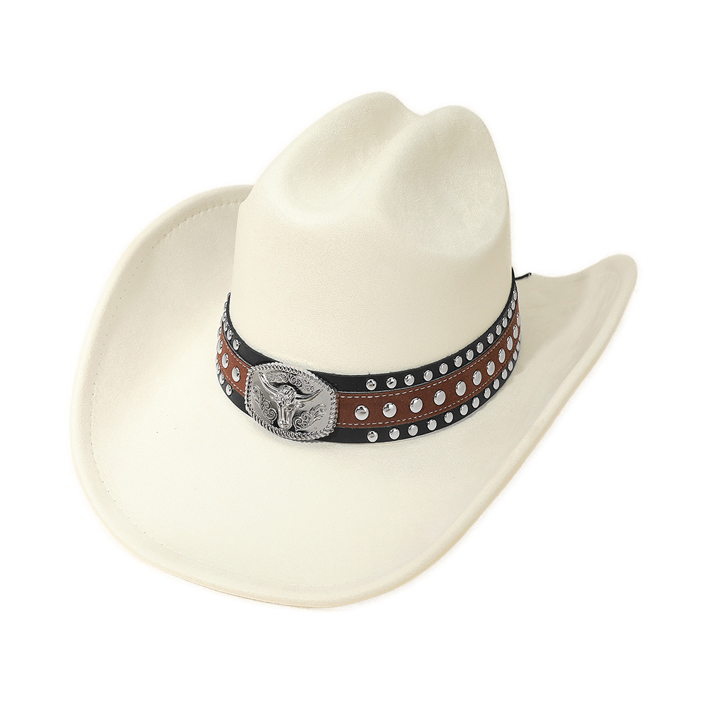 Details • Crown Circumference : 23" • Crown Height : 4.75" • Brim Height : 3.75" • Material : 100% Polyester • Western cowboy hat accented with a bold steer head buckle band, featuring studded details for a rugged finish. Perfect for rodeos, concerts, festivals, and everyday wear, this hat combines durability with authentic cowboy style, making it a standout piece in western fashion collections.