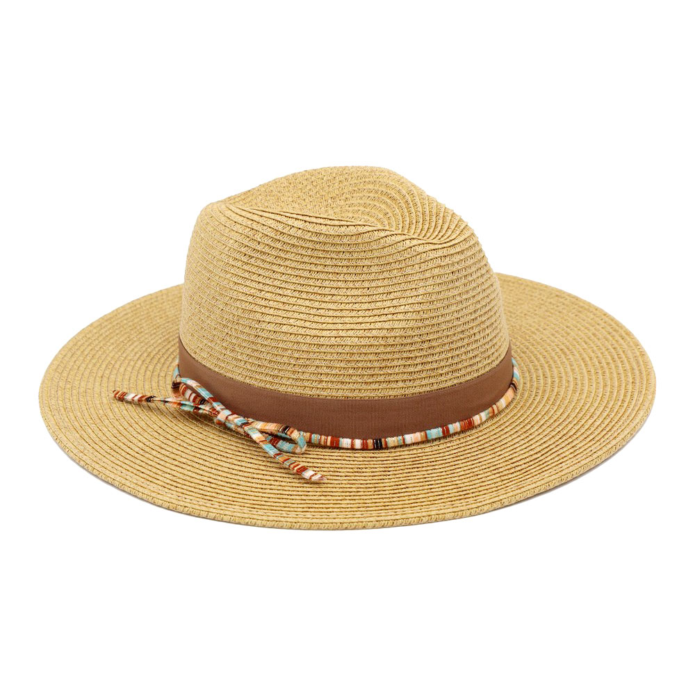 Details • Size : One Size • Material : 80% Paper, 20% Polyester • This wide brim woven fedora sun hat features a structured crown paired with a subtle decorative trim band for a refined, modern look. Designed for versatile styling, it transitions easily from casual outings to travel and resort wear. An easy-to-style accessory that adds polish to seasonal outfits while offering strong visual appeal for retail and boutique collections.