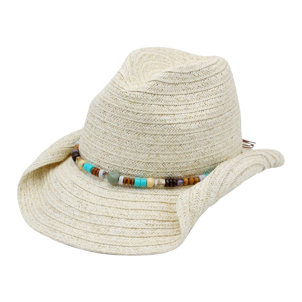 Stone Wood Beaded Band Summer Straw Cowboy Hat