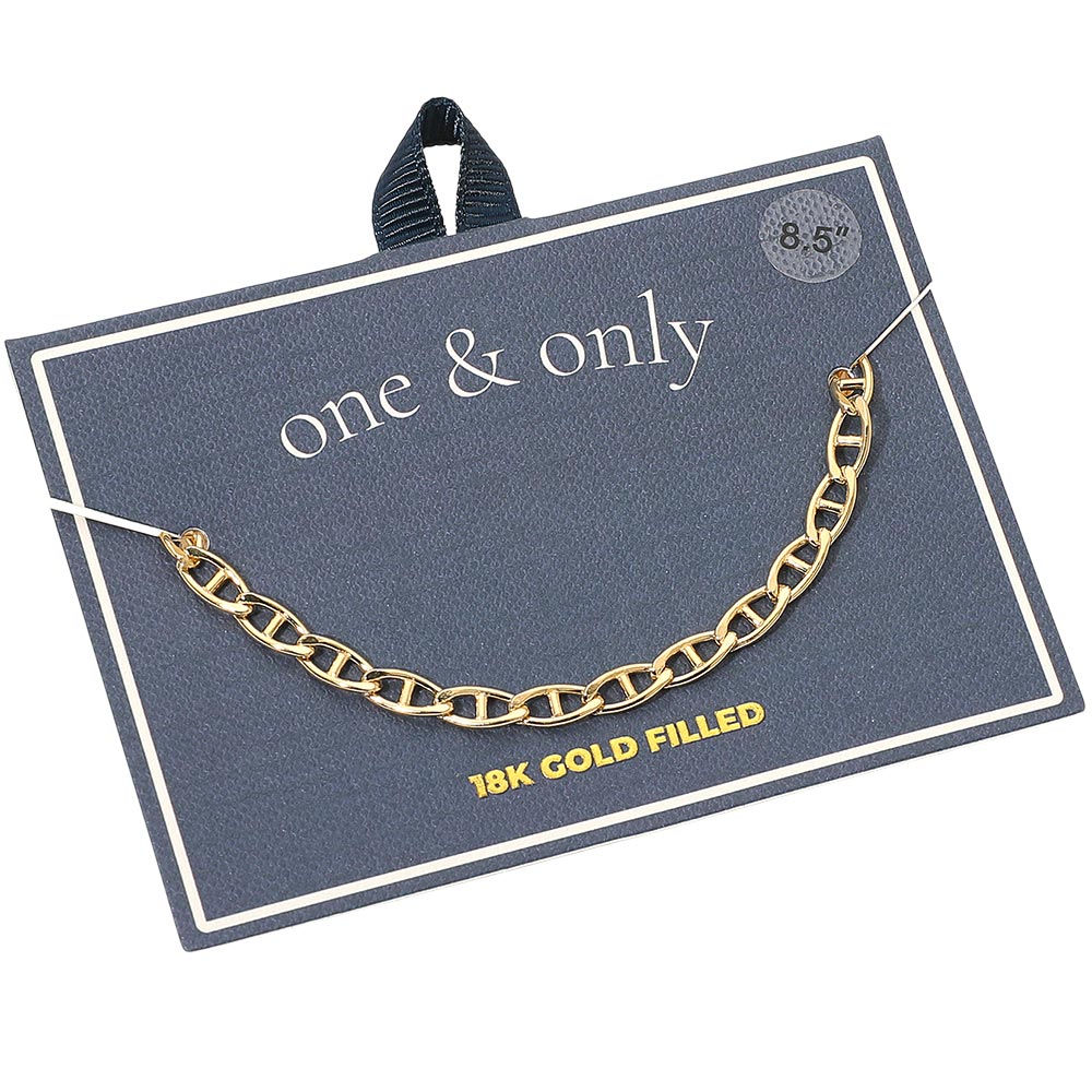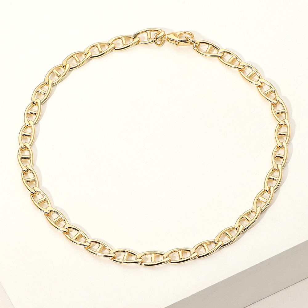 Details • Size : 0.25" H (4mm), 8.5" L • Lobster Clasp Closure • Timeless anklet featuring a classic mariner link chain that exudes effortless elegance. Crafted with an 18K gold-filled finish, this sleek and durable design adds a refined touch to everyday wear—perfect for layering or as a subtle statement of sophistication. • Gold Filled • Lead and Nickel Compliant • Made In Brazil