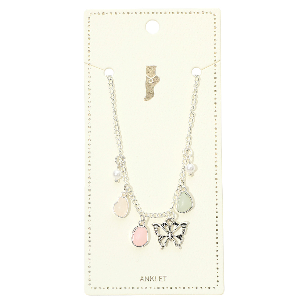 Details • Size : 0.7" H, 9.25" + 1.75" L • Lobster Clasp Closure • Butterfly charm anklet featuring delicate dangling accents and a graceful winged design that symbolizes freedom and joy. Designed to add subtle movement and a playful touch to ankle styling for everyday wear or vacations. Ideal for gifting or boutique collections inspired by nature and feminine fashion. • Lead and Nickel Compliant
