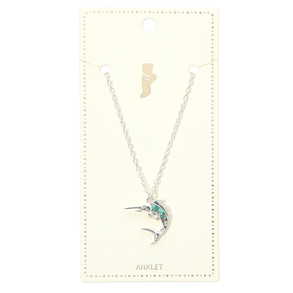 Details • Size : 9" + 1.5" L • Charm Size : 0.75" X 1" • Lobster Clasp Closure • Crushed pebble swordfish charm anklet featuring a sleek ocean-inspired pendant that brings dynamic coastal style to ankle jewelry. Lightweight and comfortable for daily wear, this anklet is perfect for summer outfits, beach vacations, resort styling, and nautical-themed boutique jewelry collections. • Lead and Nickel Compliant