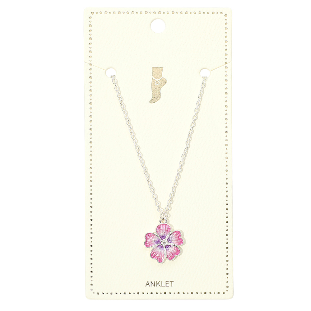 Details • Size : 9" + 1.5" L • Charm Size : 0.6" X 0.75" • Lobster Clasp Closure • Flower charm anklet featuring a soft nature-inspired floral design that adds feminine charm and gentle movement to ankle styling. Perfect for spring and summer collections, casual outfits, beachwear, and giftable assortments, this anklet appeals to customers seeking elegant, lightweight fashion jewelry with a fresh and timeless botanical feel. • Lead and Nickel Compliant