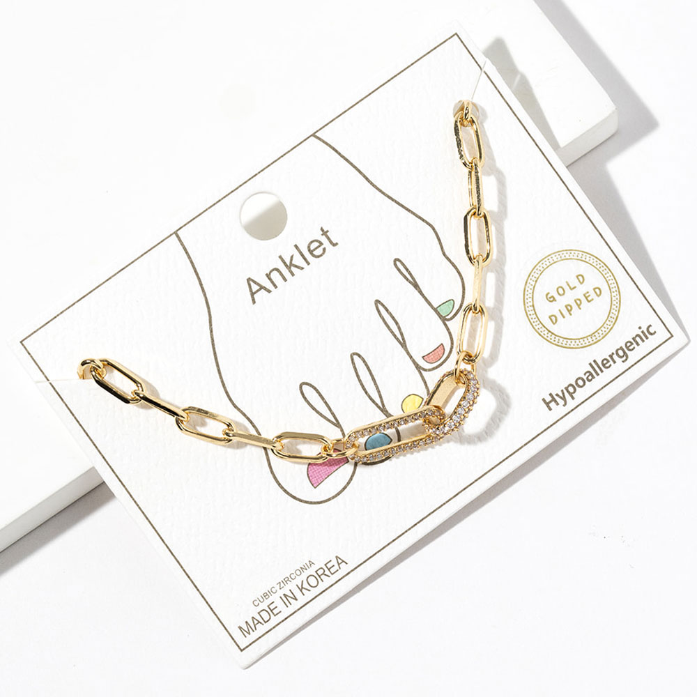 Details • Size : 0.3" H, 9" + 2" L • Lobster Clasp Closure • This stylish anklet features a modern paperclip chain design with a sparkling cubic zirconia-accented charm for added shine. Hypoallergenic and gold-dipped for lasting wear, it brings a chic, minimalist touch to summer outfits. Perfect for everyday elegance or layered looks. • Lead and Nickel Compliant • Hypoallergenic • Made In Korea • Gold Dipped • CZ Cubic Zirconia