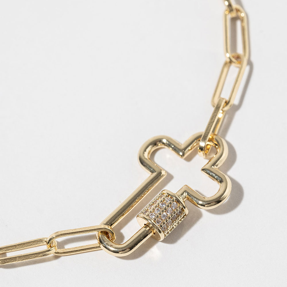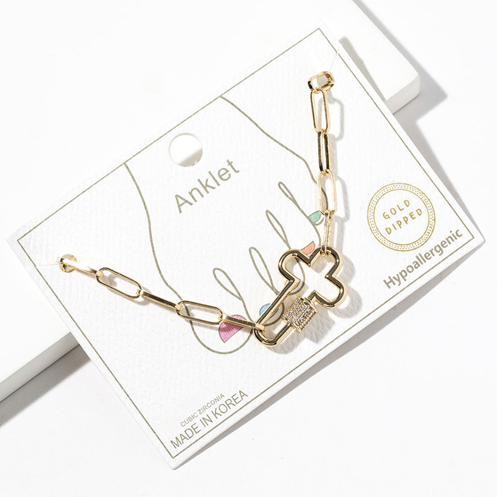 Gold Dipped CZ Stone Paved Open Cross Carabiner Paperclip Link Chain Anklet