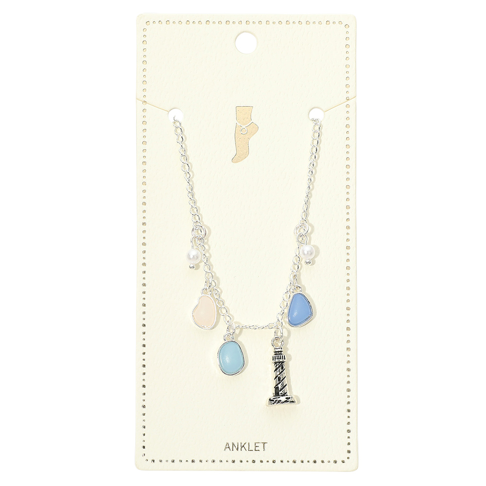 Details • Size : 0.75" H, 9.25" + 1.75" L • Lobster Clasp Closure • Lighthouse charm anklet featuring delicate dangling accents and a coastal-inspired design that symbolizes guidance and seaside charm. Designed to add subtle movement and character to ankle styling for everyday wear or vacation looks. Ideal for gifting or boutique collections focused on beach, ocean, and nautical-themed fashion jewelry. • Lead and Nickel Compliant