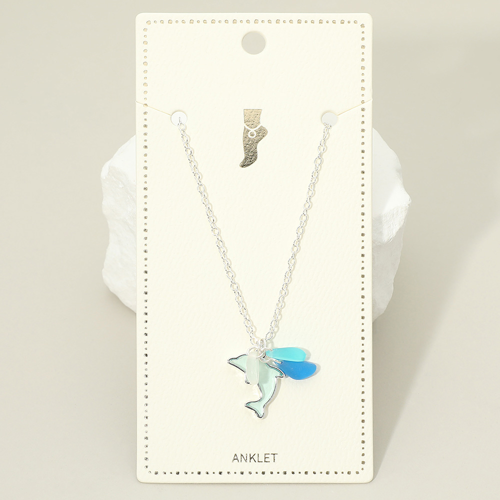 Details • Size : 9" + 1.5" L • Charm Size : 0.6" X 0.75" • Lobster Clasp Closure • Dolphin charm anklet featuring a layered ocean-inspired design that adds playful movement and coastal charm to ankle styling. Lightweight and easy to wear for everyday outfits or vacation looks. Ideal for gifting or boutique collections focused on beach, marine, and summer-themed fashion jewelry. • Lead and Nickel Compliant