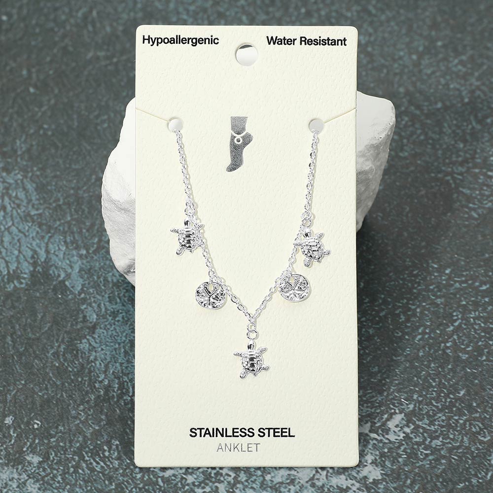 Details • Size : 9" + 1.5" L • Charm Size : 0.7" L • Lobster Clasp Closure • Water Resistant • Charming anklet designed with turtle sand dollar charms and coin accents for a playful coastal-inspired look. Lightweight and comfortable for everyday wear, this anklet adds personality to casual outfits, vacation styling, or layered jewelry looks with a fun and meaningful touch. • Hypoallergenic • Stainless Steel