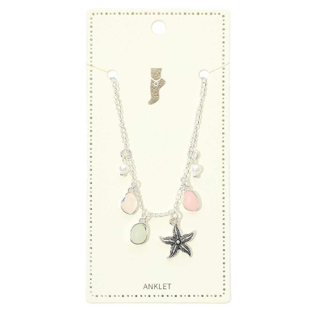 • Starfish charm anklet featuring delicate dangling accents that create a relaxed, beach-inspired look. Designed to add subtle movement and charm to ankle styling for everyday wear or vacations. Ideal for gifting or boutique collections focused on coastal, ocean, and nature-themed fashion jewelry.