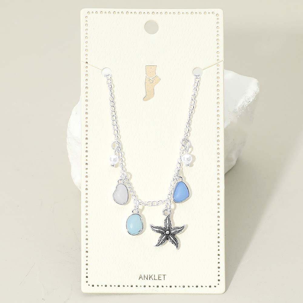 Details • Size : 0.75" H, 9.25" + 1.75" L • Lobster Clasp Closure • Starfish charm anklet featuring delicate dangling accents that create a relaxed, beach-inspired look. Designed to add subtle movement and charm to ankle styling for everyday wear or vacations. Ideal for gifting or boutique collections focused on coastal, ocean, and nature-themed fashion jewelry. • Lead and Nickel Compliant