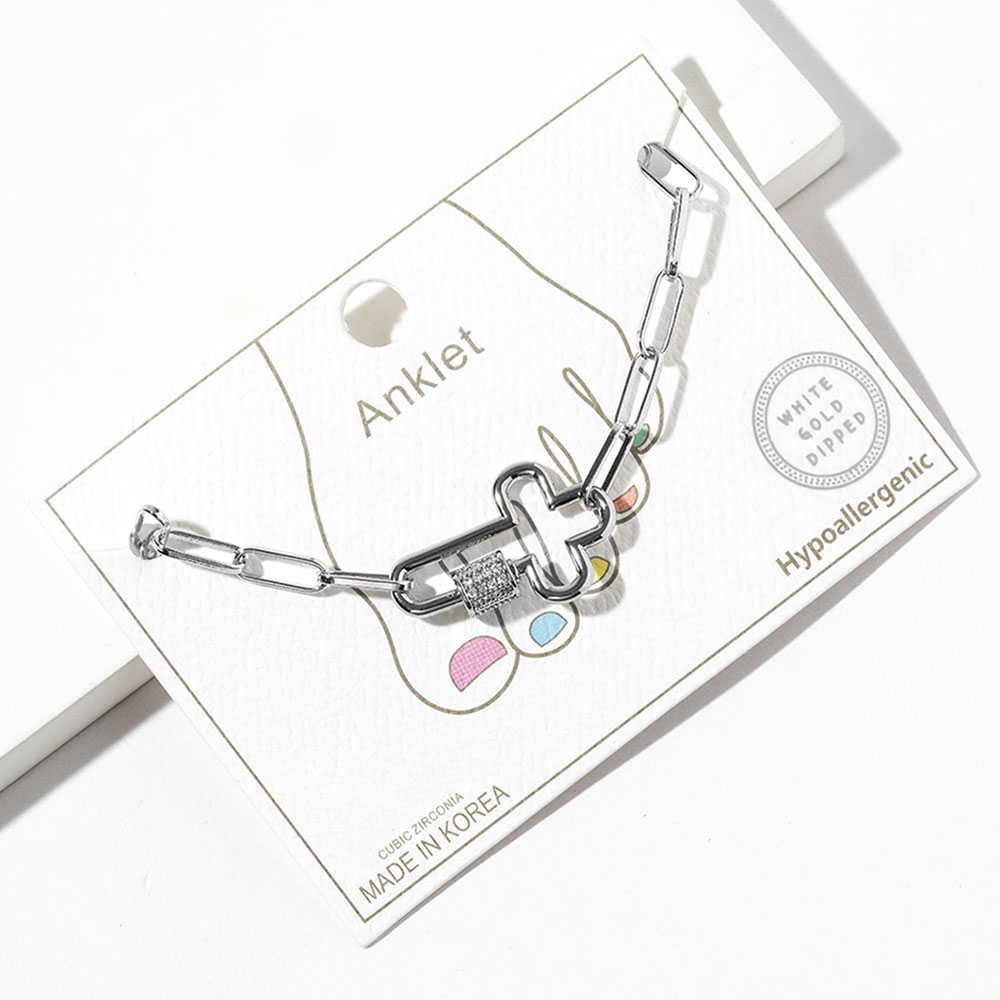 White Gold Dipped CZ Stone Paved Open Cross Carabiner Paperclip Link Chain Anklet