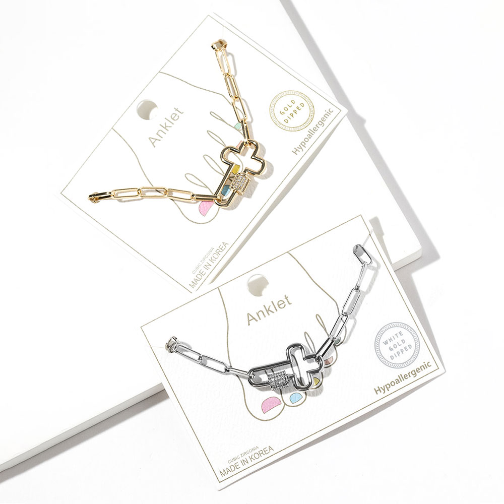 • Elegant cross charm anklet featuring a modern link chain design accented with sparkling cz stone details. This ankle bracelet adds a refined yet playful touch to everyday and dressy looks, making it perfect for layering or wearing solo. A versatile accessory ideal for boutiques, seasonal styling, and trend-forward collections.