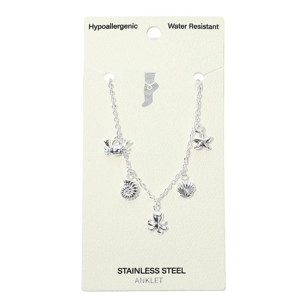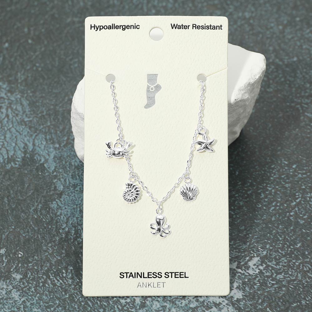 Details • Size : 9" + 1.5" L • Charm Size : 0.7" L • Lobster Clasp Closure • Water Resistant • Playful ocean-inspired anklet featuring mixed sea charms including shell, starfish, crab, and octopus details. Designed for everyday comfort and easy styling, this anklet adds a fun coastal touch to casual outfits, vacation looks, or layered jewelry collections. • Hypoallergenic • Stainless Steel