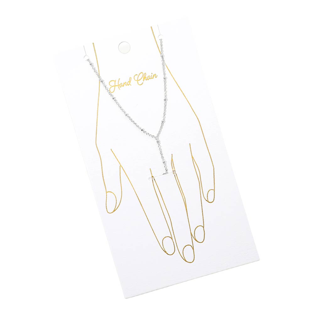 • Minimal hand chain bracelet featuring a slim wrist chain connected to a subtle finger ring for an elegant, modern look. Designed to sit comfortably on the hand, this refined piece adds graceful movement and visual interest. Ideal for boutique displays, gifting, special occasions, or everyday styling with a clean, feminine aesthetic.