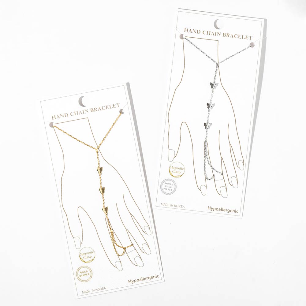 • This stylish hand chain bracelet features a delicate wrist-to-finger design accented with butterfly details for a graceful, eye-catching look. Designed with a secure magnetic clasp for easy wear, it offers effortless styling for everyday outfits, special occasions, and curated boutique jewelry collections. Perfect for customers seeking unique, modern hand jewelry with elegant movement.