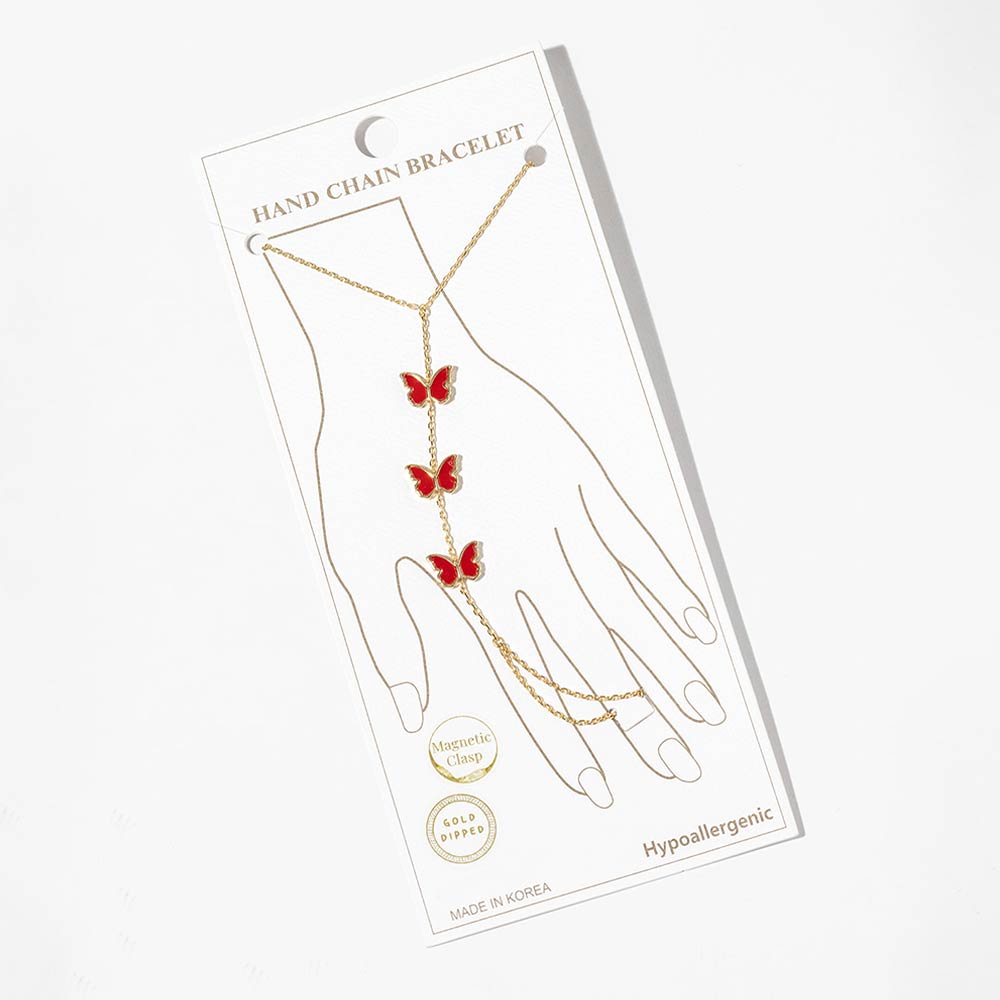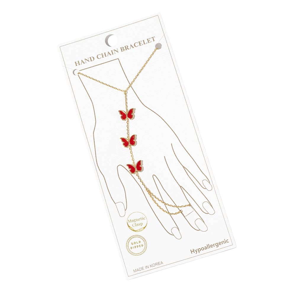 • This butterfly hand chain bracelet features a delicate wrist-to-finger design accented with butterfly charms for a graceful, eye-catching look. Designed with a magnetic clasp for easy wear, it offers elegant movement and statement appeal. Ideal for boutique jewelry collections, layering styles, and everyday or special occasion accessorizing.