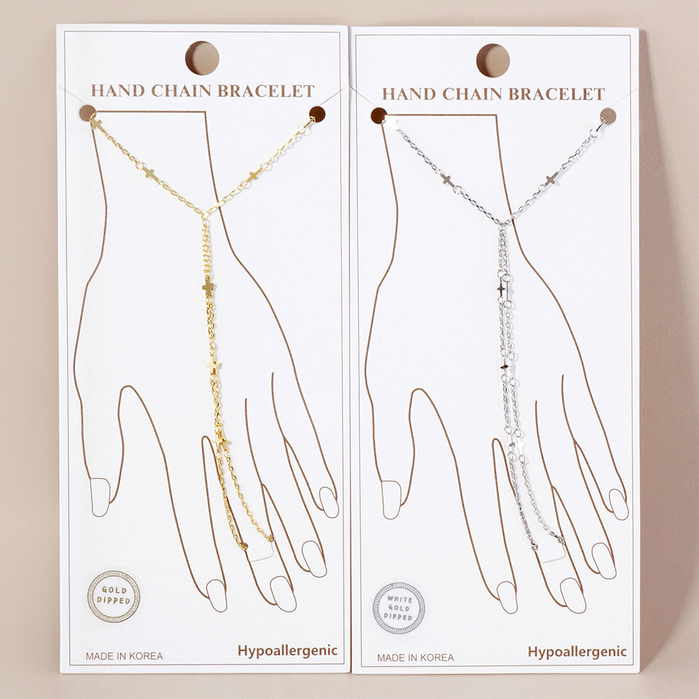 Details • Bracelet Size : 7" + 1" L, 3" H • Ring Size: Free • Elegant hand chain bracelet featuring a delicate cross design. Ideal for everyday wear or special occasions. Made with attention to quality and style. • Lead and Nickel Compliant • Hypoallergenic • Made In Korea • Gold Dipped