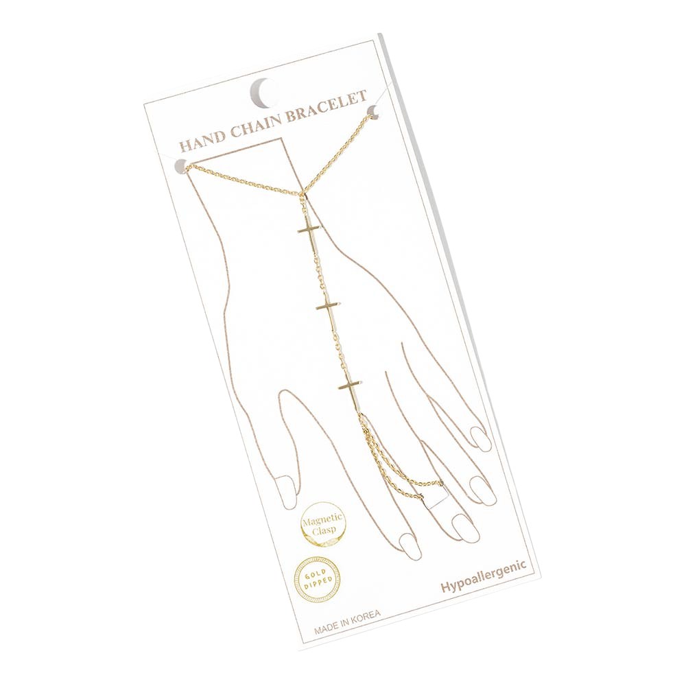 Details • Size : 2.8" H, 7" + 0.25" L • Ring Size : Free • Magnetic Clasp Closure • This cross hand chain bracelet features a sleek wrist-to-finger design accented with multiple cross charms for a clean, meaningful statement. Designed with a magnetic clasp for easy wear and secure fit, it offers elegant drape and everyday versatility. Ideal for boutique jewelry collections, layering looks, faith-inspired styling, and modern accessory assortments. • Lead and Nickel Compliant • Hypoallergenic • Made In Korea • Gold Dipped