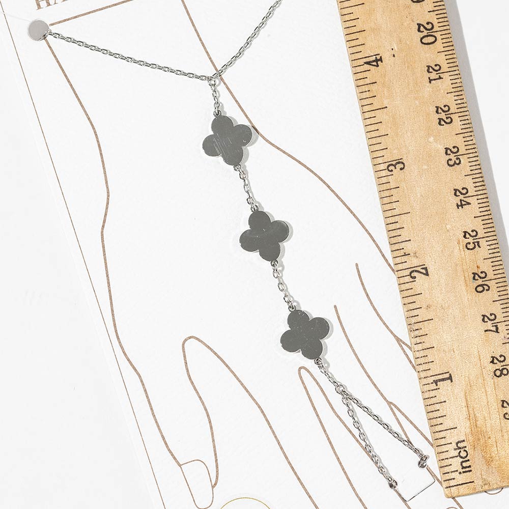 Details • Size : 3.2" H, 7" + 0.25" L • Ring Size : Free • Magnetic Clasp Closure • This quatrefoil hand chain bracelet features a refined wrist-to-finger silhouette accented with multiple quatrefoil charms for a balanced, elegant look. Designed with a magnetic clasp for easy wear and secure fit, it offers graceful drape and everyday versatility. Ideal for boutique jewelry collections, layering styles, gifting displays, and trend-forward accessory assortments. • Gold Dipped • Hypoallergenic • Lead and Nickel Compliant • Made In Korea