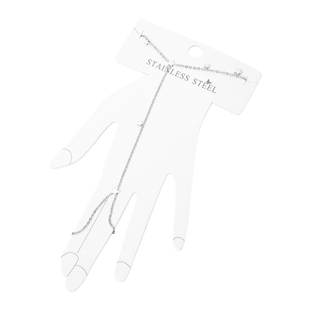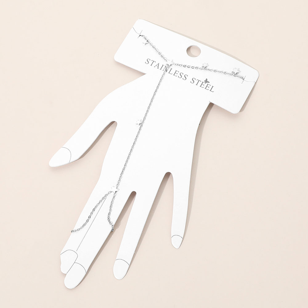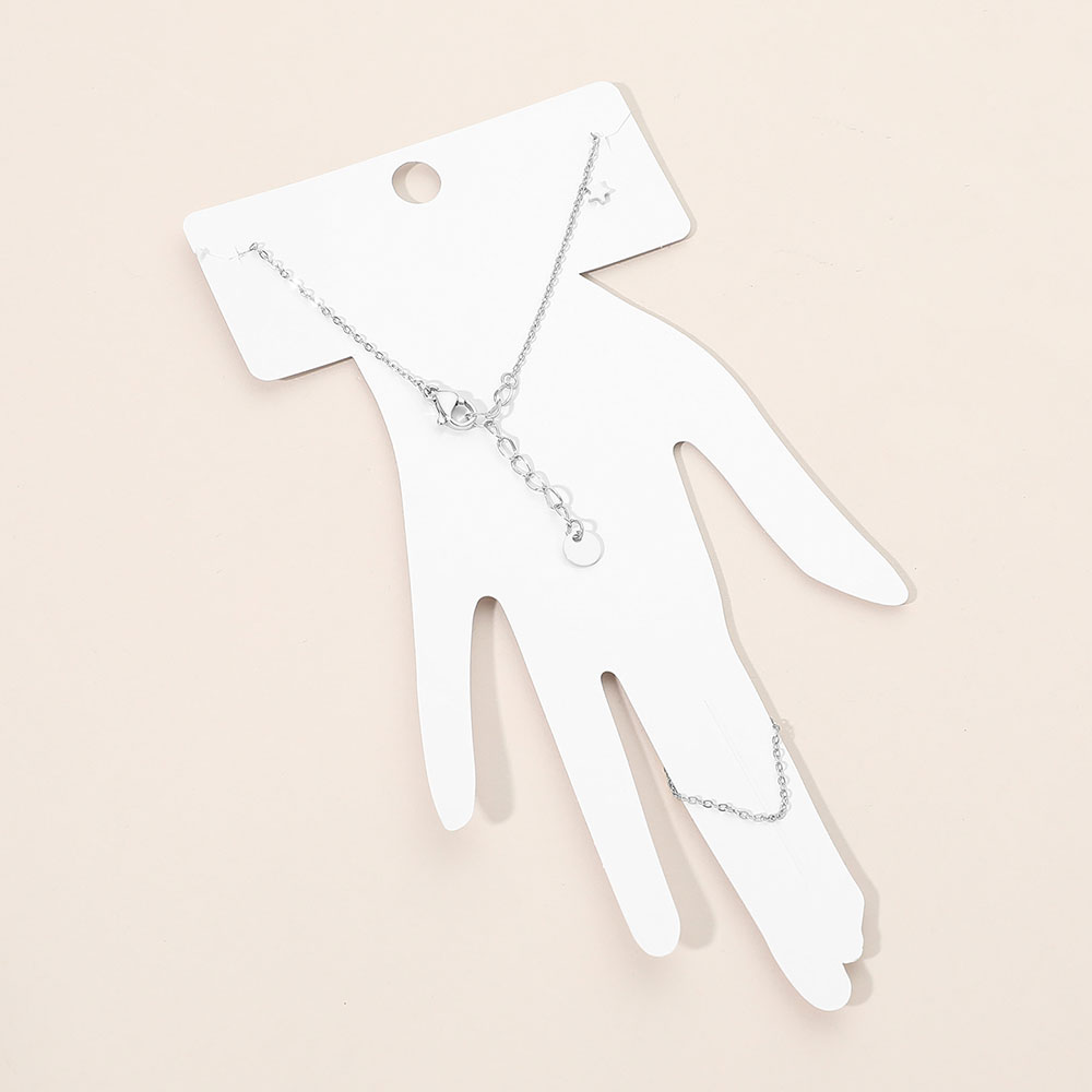 Details • Size : 3.5" H, 6.5" + 1.5" L • Ring Size : Free • Delicate star charm hand chain bracelet ring designed to connect finger and wrist with a sleek, modern silhouette. Perfect for everyday styling, layering, or gifting. A trendy statement piece for boutiques, fashion collections, and customers seeking minimalist yet eye-catching jewelry. • Stainless Steel