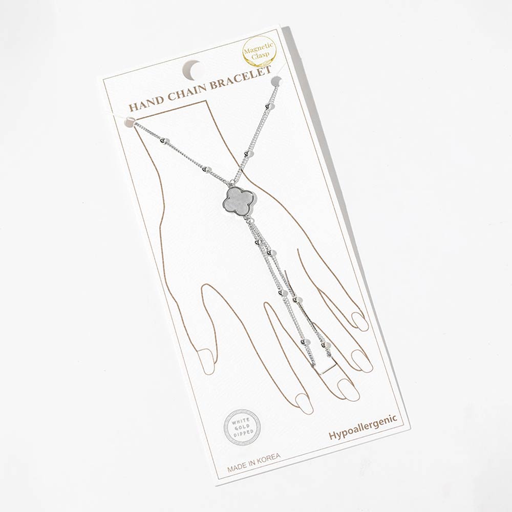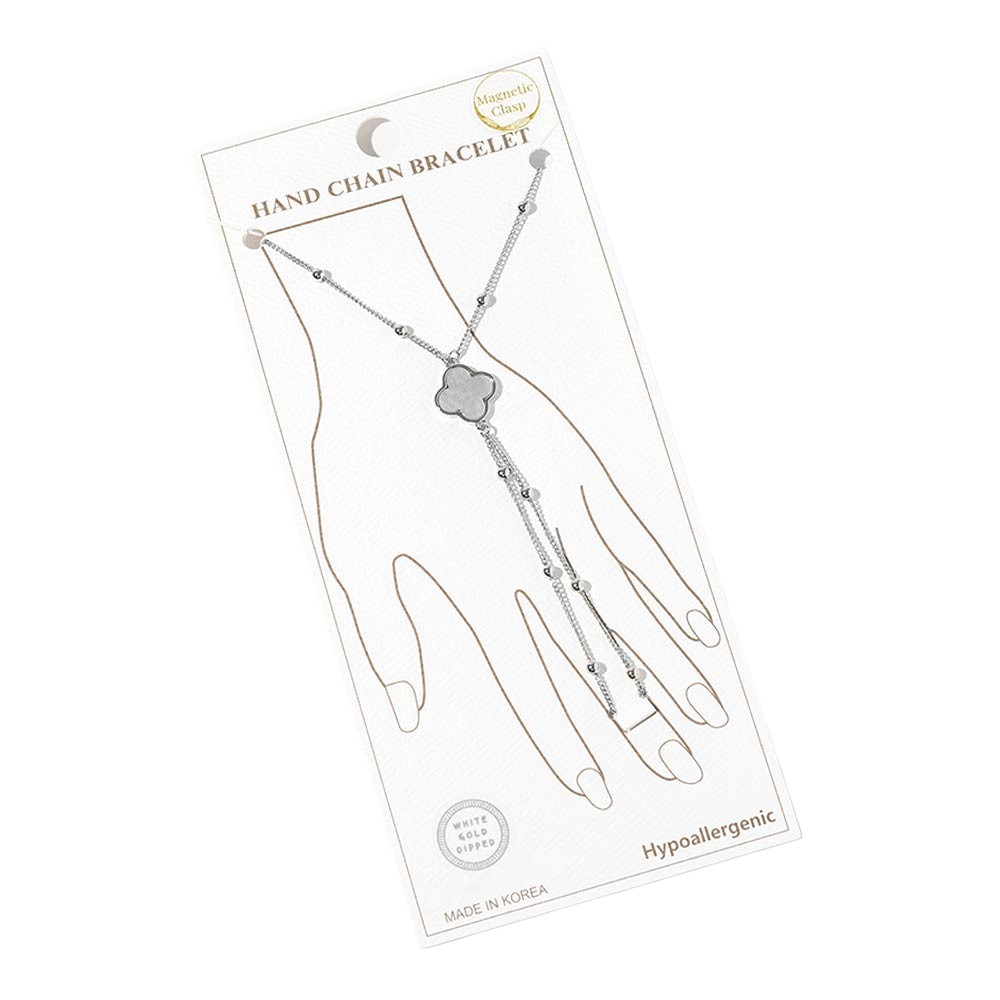 White Gold Dipped Beaded Mother of Pearl Quatrefoil Accent Hand Chain Magnetic Bracelet