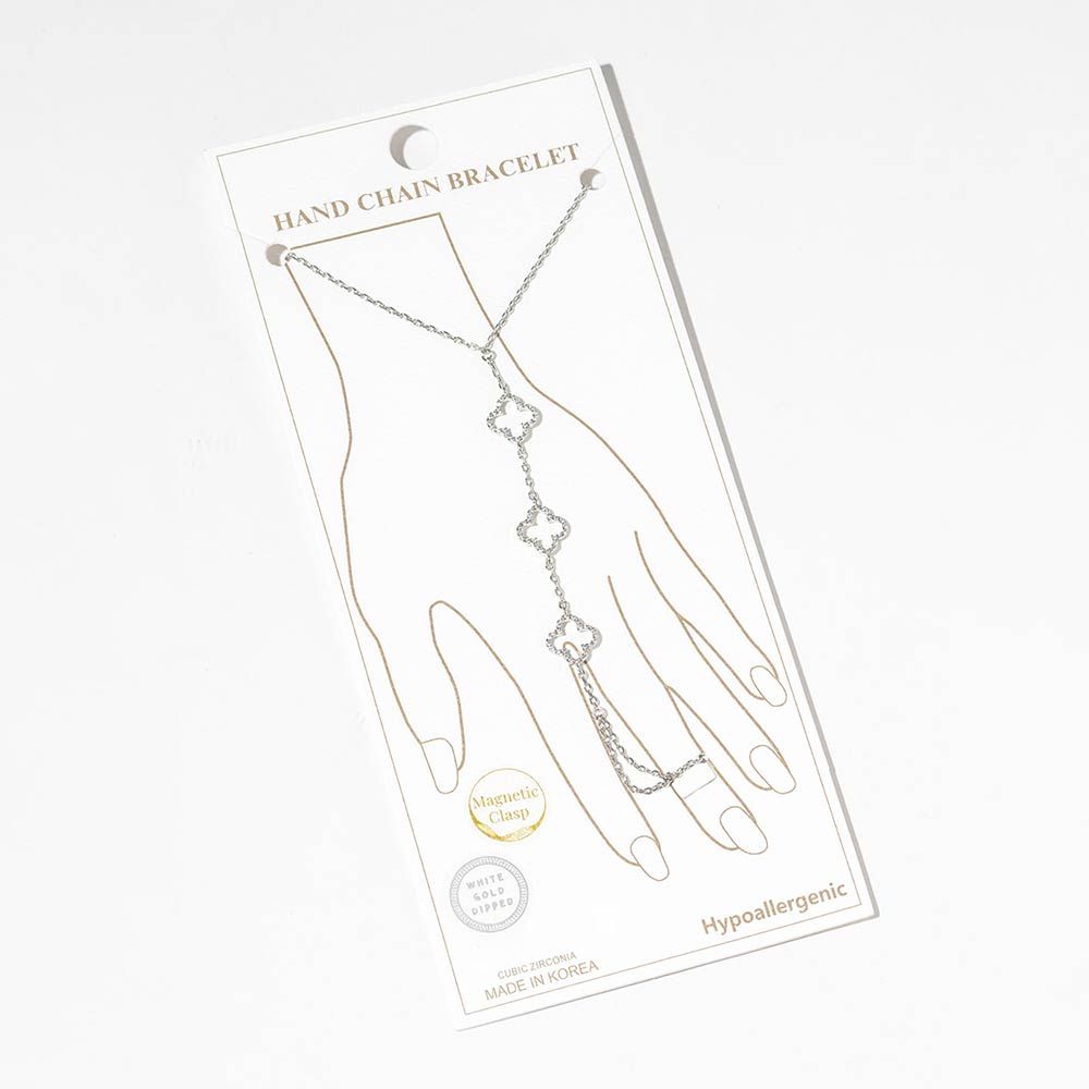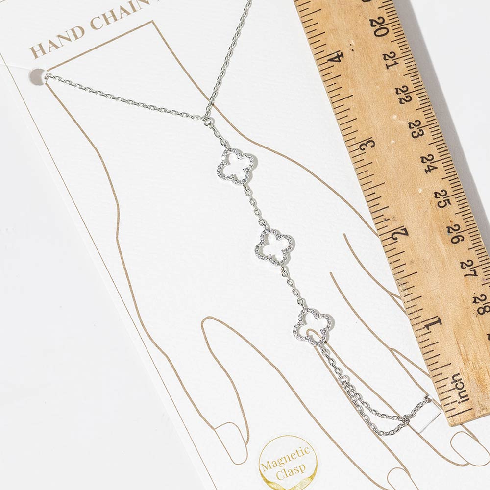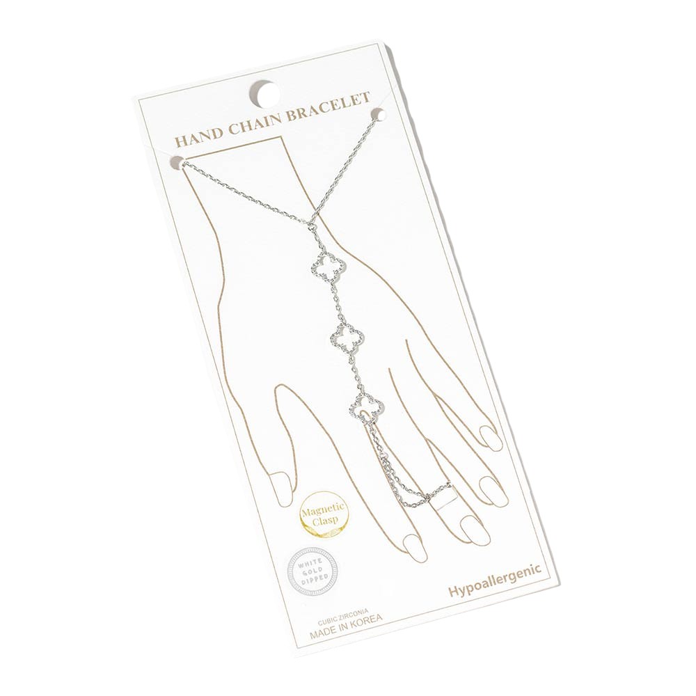 Details • Size : 3.25" H, 7" + 0.25" L • Ring Size : Free • Magnetic Clasp Closure • This quatrefoil hand chain bracelet features a refined wrist-to-finger silhouette accented with repeating clover-inspired stations for a balanced, elegant look. Designed with a magnetic clasp for easy wear and secure fit, it offers graceful movement and layered appeal. Ideal for boutique jewelry assortments, gift collections, and trend-forward displays that highlight delicate hand jewelry styling. • CZ Cubic Zirconia • Gold Dipped • Hypoallergenic • Lead and Nickel Compliant • Made In Korea