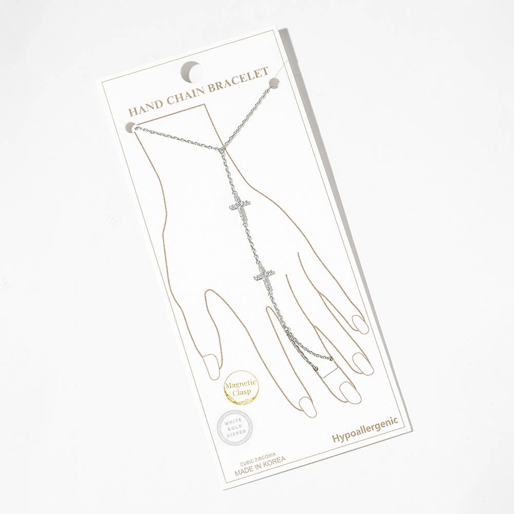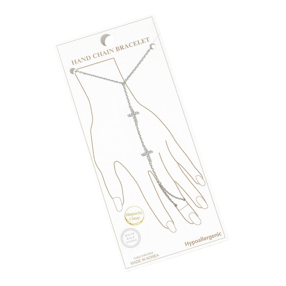 White Gold Dipped Delicate CZ Pave Cross Charm Accent Hand Chain Magnetic Bracelet