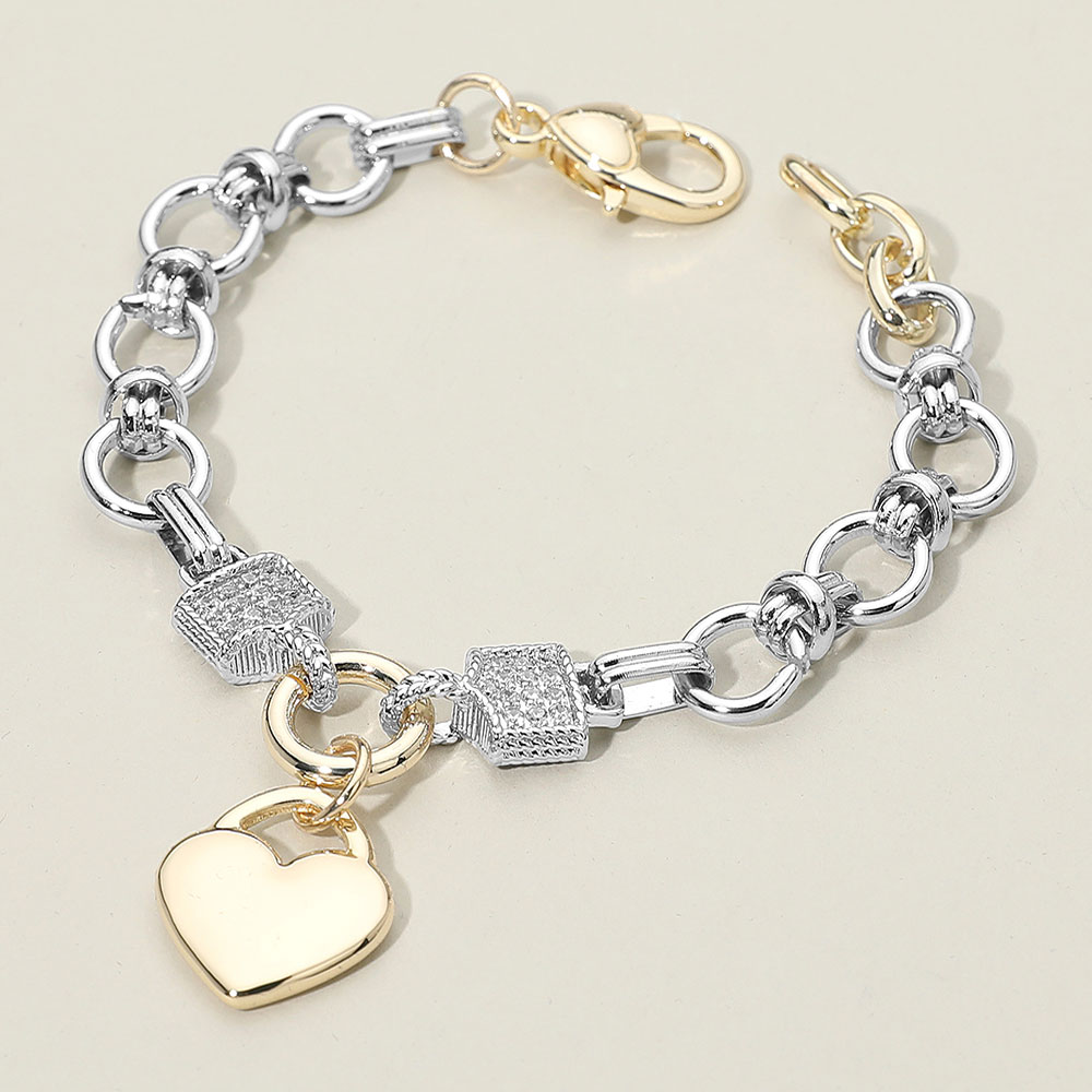 Details • Size : 0.4" H, 7.5" + 1" L • Charm Size : 0.75" X 0.75" • Lobster Clasp Closure • Stylish link bracelet featuring a heart charm and textured geometric accents. Designed with interlocking rings and a secure clasp for a refined finish. This elegant accessory adds a touch of romance and sophistication, perfect for layering or gifting for any special occasion. • CZ Cubic Zirconia • Gold Dipped