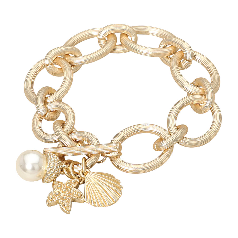 14K Gold Plated Pearl Starfish Shell Charm Chunky Chain Toggle Bracelet