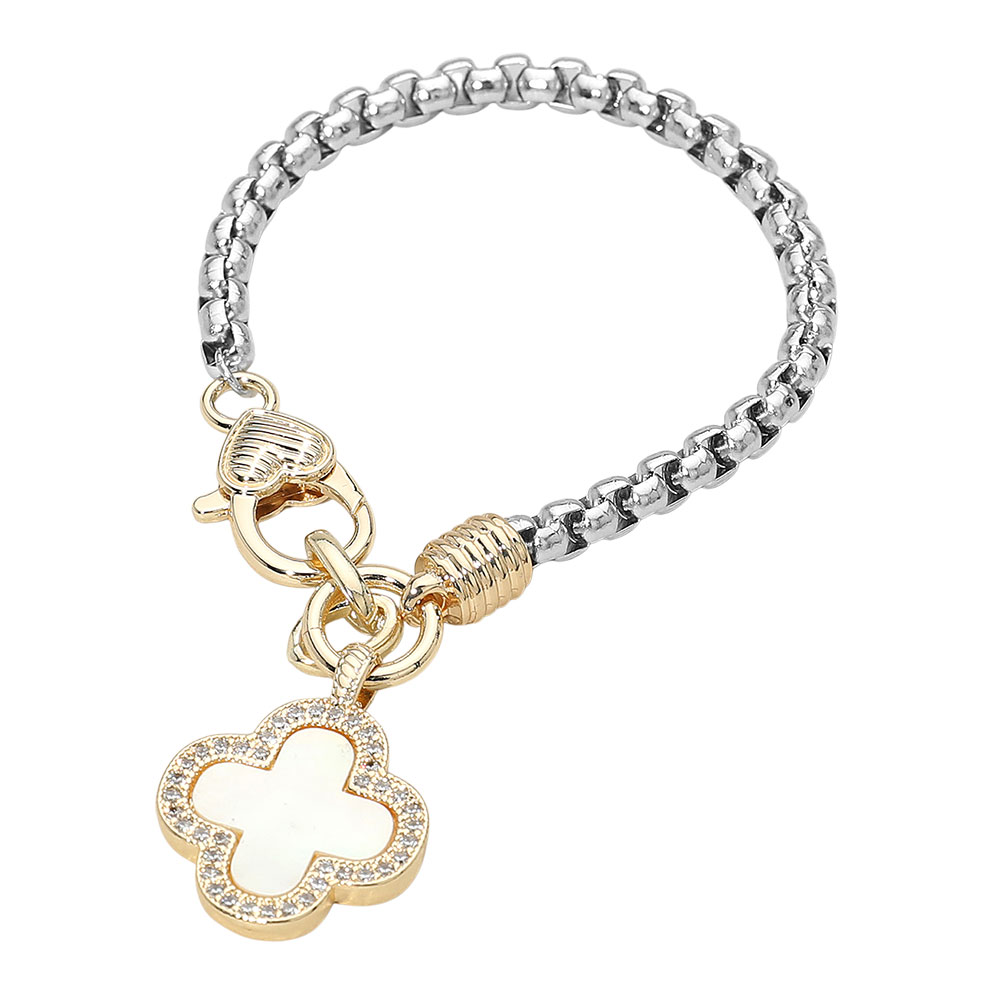 14K Gold Plated Two Tone CZ Stone Paved Quatrefoil Charm Bracelet
