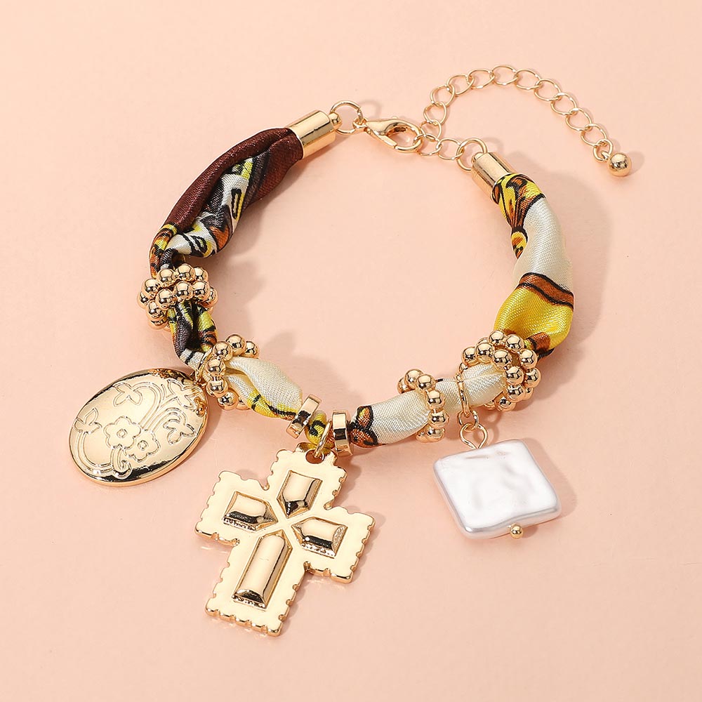 Boho Metal Cross Square Pearl Floral Oval Charm Fabric Bracelet