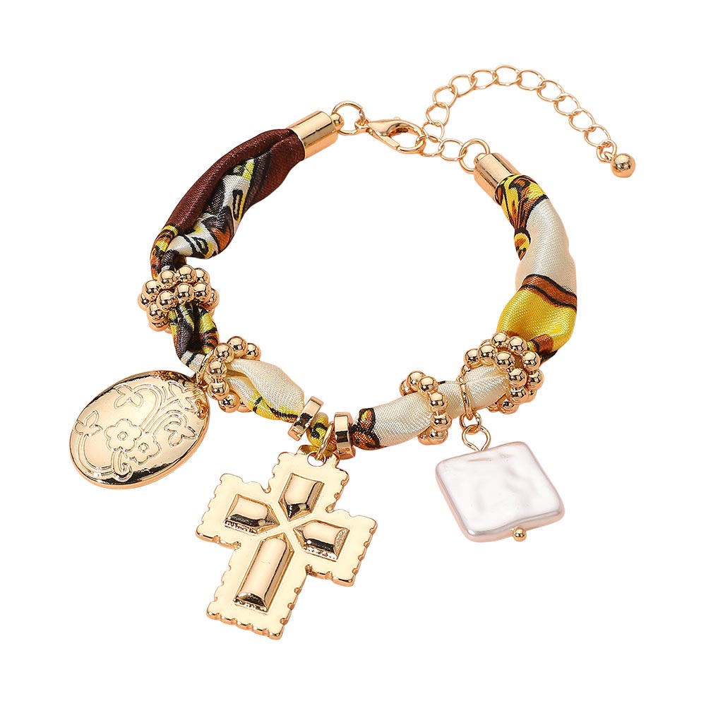 • Elevate your accessory style with this Charm Pendant Fabric Bracelet, featuring a braided fabric band adorned with gold-tone beads, a cross pendant, and chic charm accents. A perfect blend of modern design and timeless elegance, ideal for both casual and statement looks