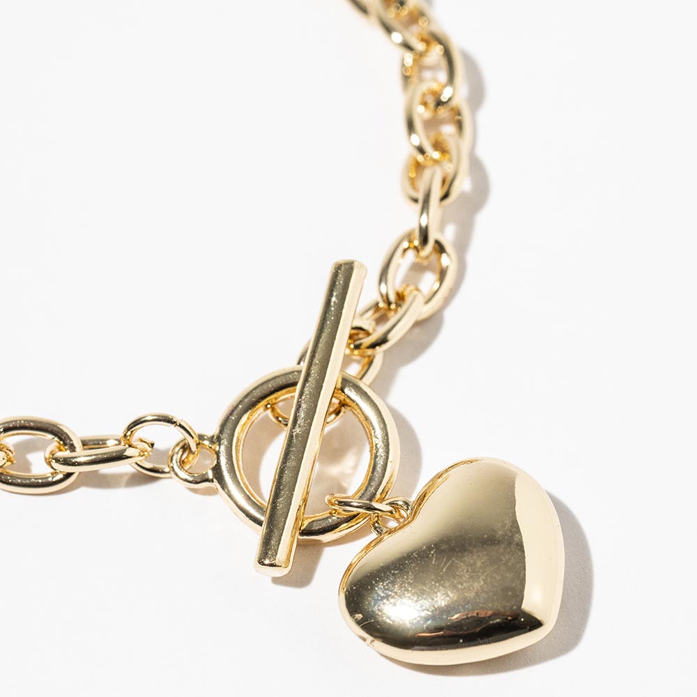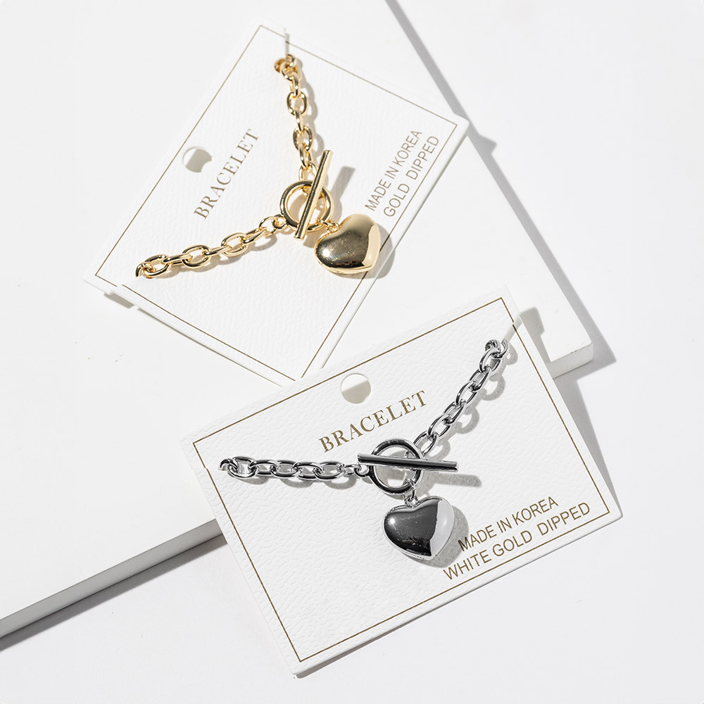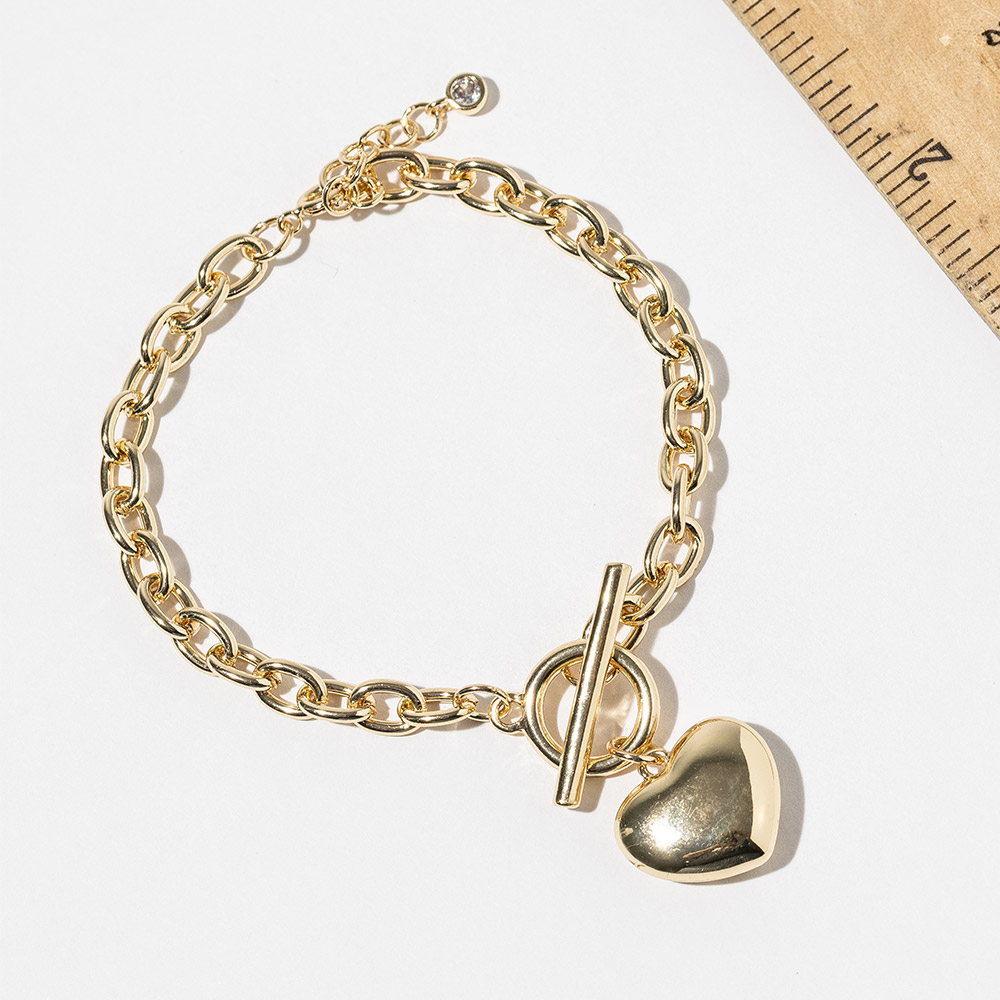 Details • Size : 0.25" H, 7" + 1" L • Charm Size : 0.7" X 0.6" • Lobster Clasp Closure • Discover a stylish toggle heart charm chain bracelet designed for everyday elegance. This modern accessory features a polished heart pendant and a secure closure, making it perfect for layering or wearing solo. A chic bracelet that adds a playful yet refined detail to casual and dressy looks. • Lead and Nickel Compliant • Made In Korea • Gold Dipped