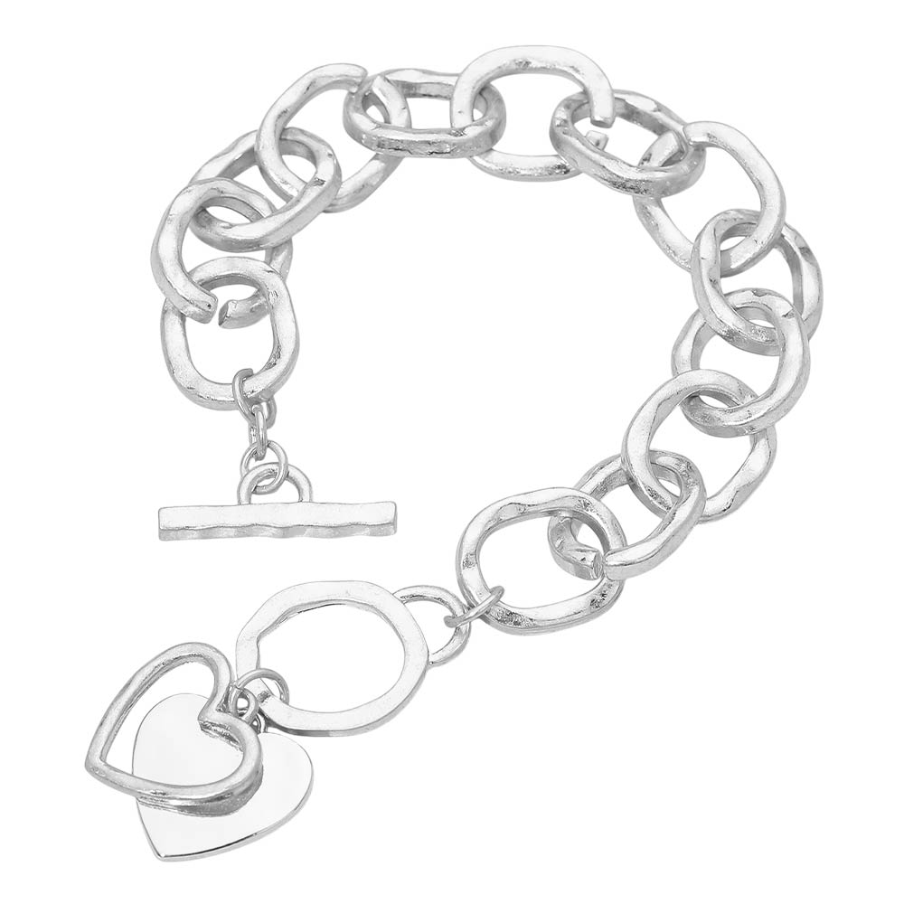 Hammered Layered Heart Charm Chunky Chain Toggle Bracelet