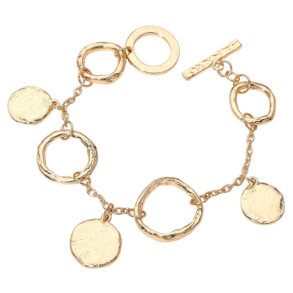 • Statement charm bracelet featuring linked circular elements and softly textured drop accents for a modern, eye-catching look. Designed to move with every gesture, it layers easily with other accessories or shines as a bold solo piece.