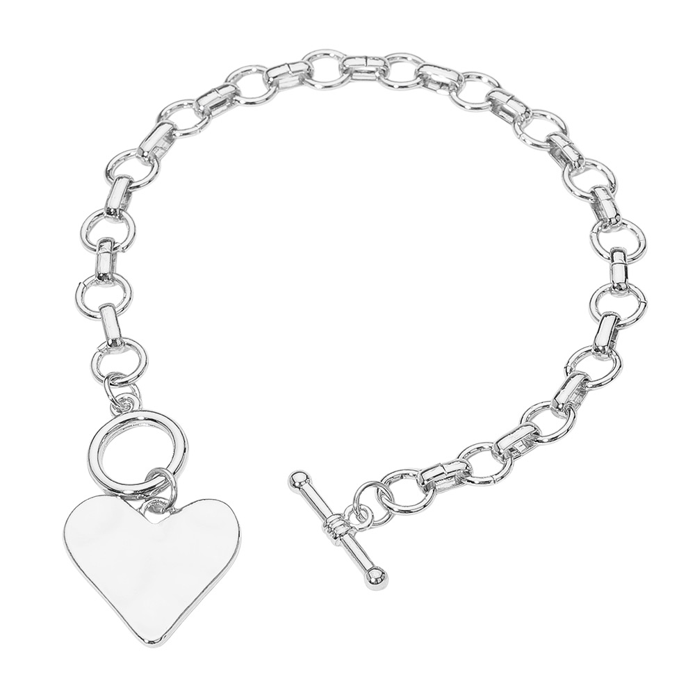 Details • Size : 7.5" L • Charm Size : 0.8" X 0.8" • Toggle Closure • Chic bracelet featuring a chain link design with a heart charm and toggle closure, adding a touch of playful elegance to any style. Perfect for layering or wearing solo, this accessory delivers a trendy and polished finish for everyday or special looks. • Lead and Nickel Compliant