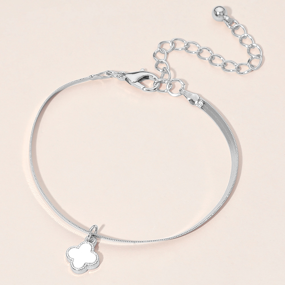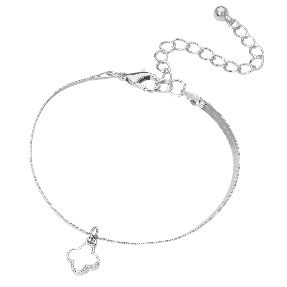 Details • Size : 7.5" + 3.25" L • Charm Size : 0.3" X 0.5" • Lobster Clasp Closure • This minimalist charm chain bracelet features a sleek quatrefoil shaped pendant on a slim chain with an adjustable extension for a comfortable fit. Designed for effortless everyday wear, it layers easily with other bracelets and adds subtle charm to casual, work, or gift ready accessory collections for boutiques and online shops. • Sterling Silver Dipped • Lead and Nickel Compliant