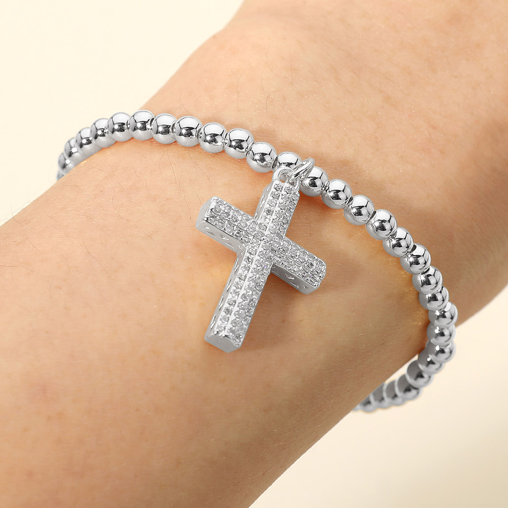 Stainless Steel CZ Paved Cross Charm Beaded Stretch Bracelet Stainless Steel CZ Paved Cross Charm Beaded Stretch Bracelet Stainless Steel CZ Paved Cross Charm Beaded Stretch Bracelet