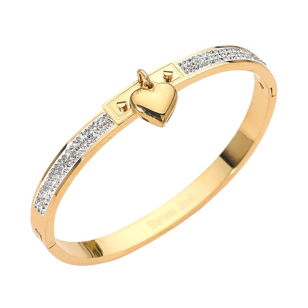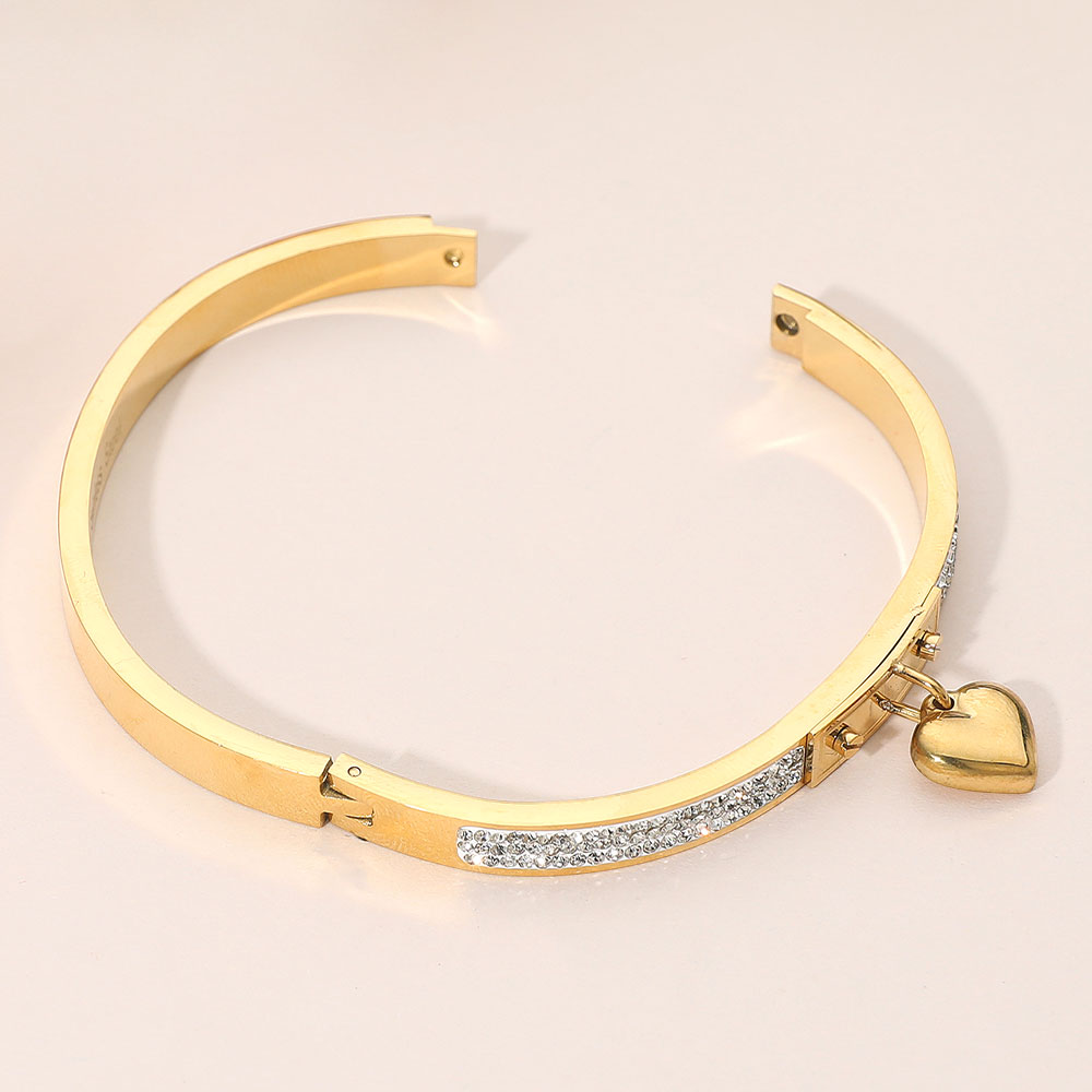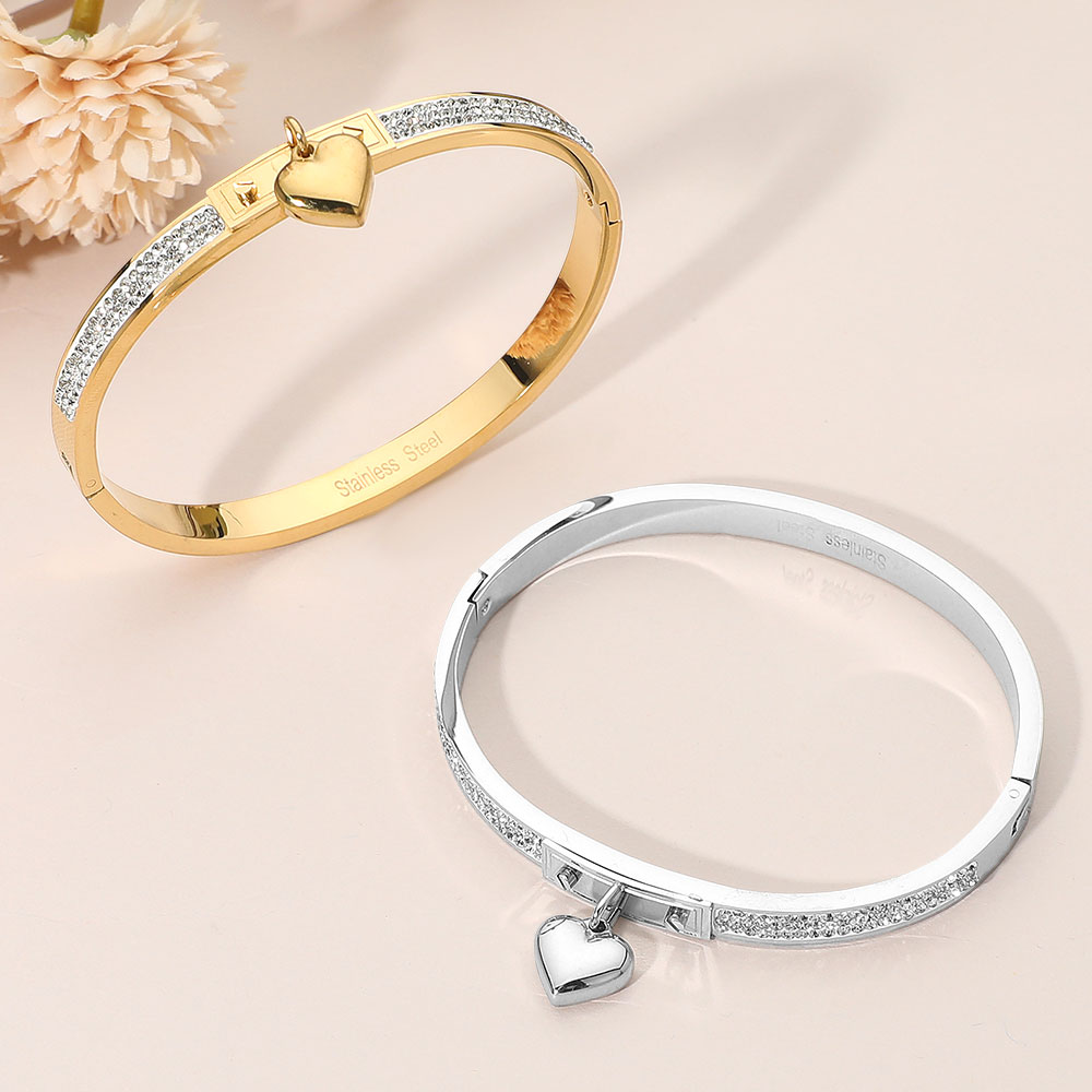 Details • Size : 0.25" H, 2.3" D • Charm Size : 0.6" L • Hinged Closure • Sleek bangle featuring a dangling heart charm with subtle sparkle accents for a romantic, modern look. Comfortable for daily wear and easy to layer or style solo, making it a versatile accessory for gifting, date nights, or elevating everyday outfits. • CZ Cubic Zirconia • Stainless Steel