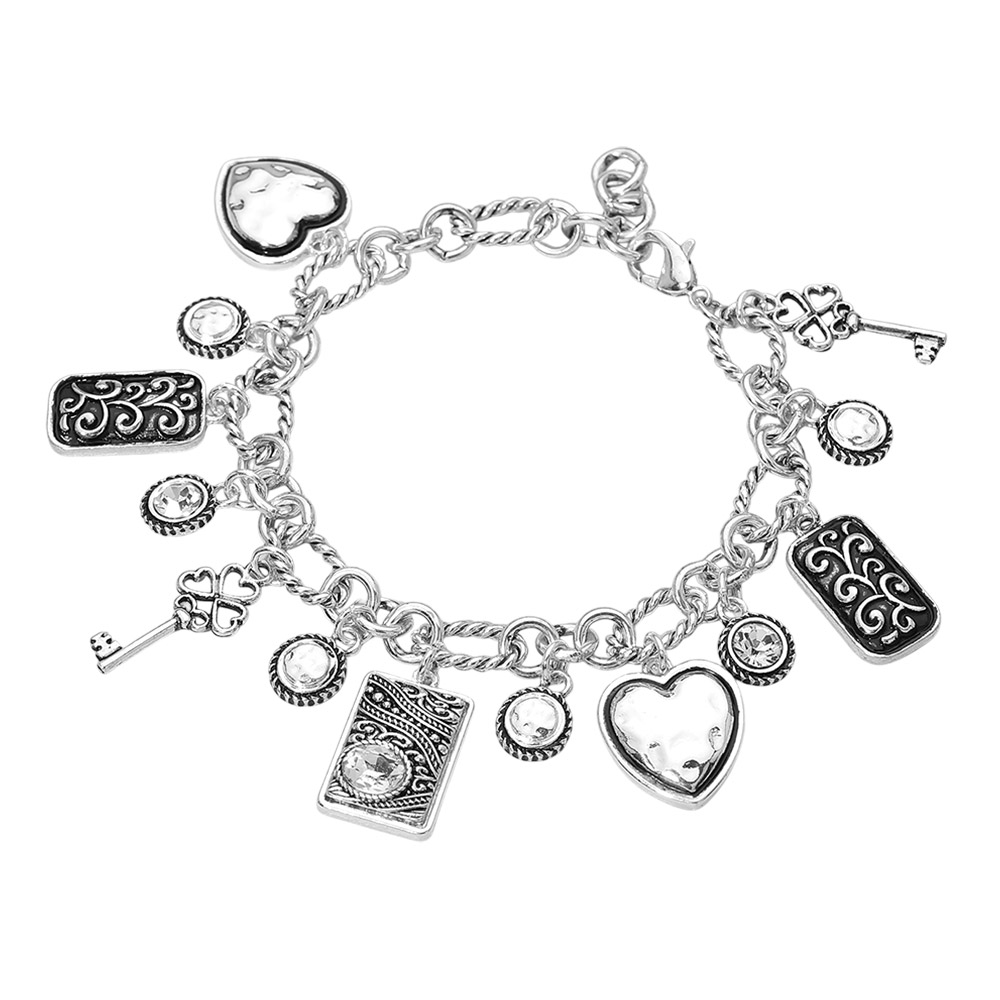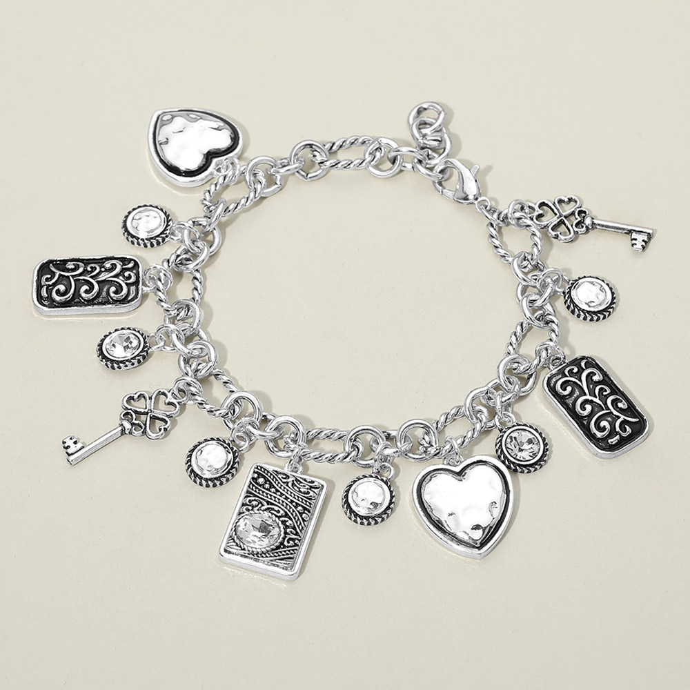 Two Tone Antique Metal Heart Key Stone Rectangular Scrollwork Charm Station Bracelet Two Tone Antique Metal Heart Key Stone Rectangular Scrollwork Charm Station Bracelet