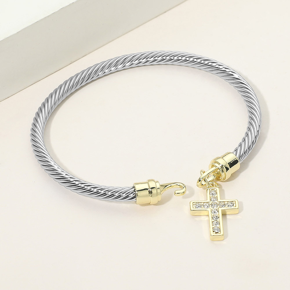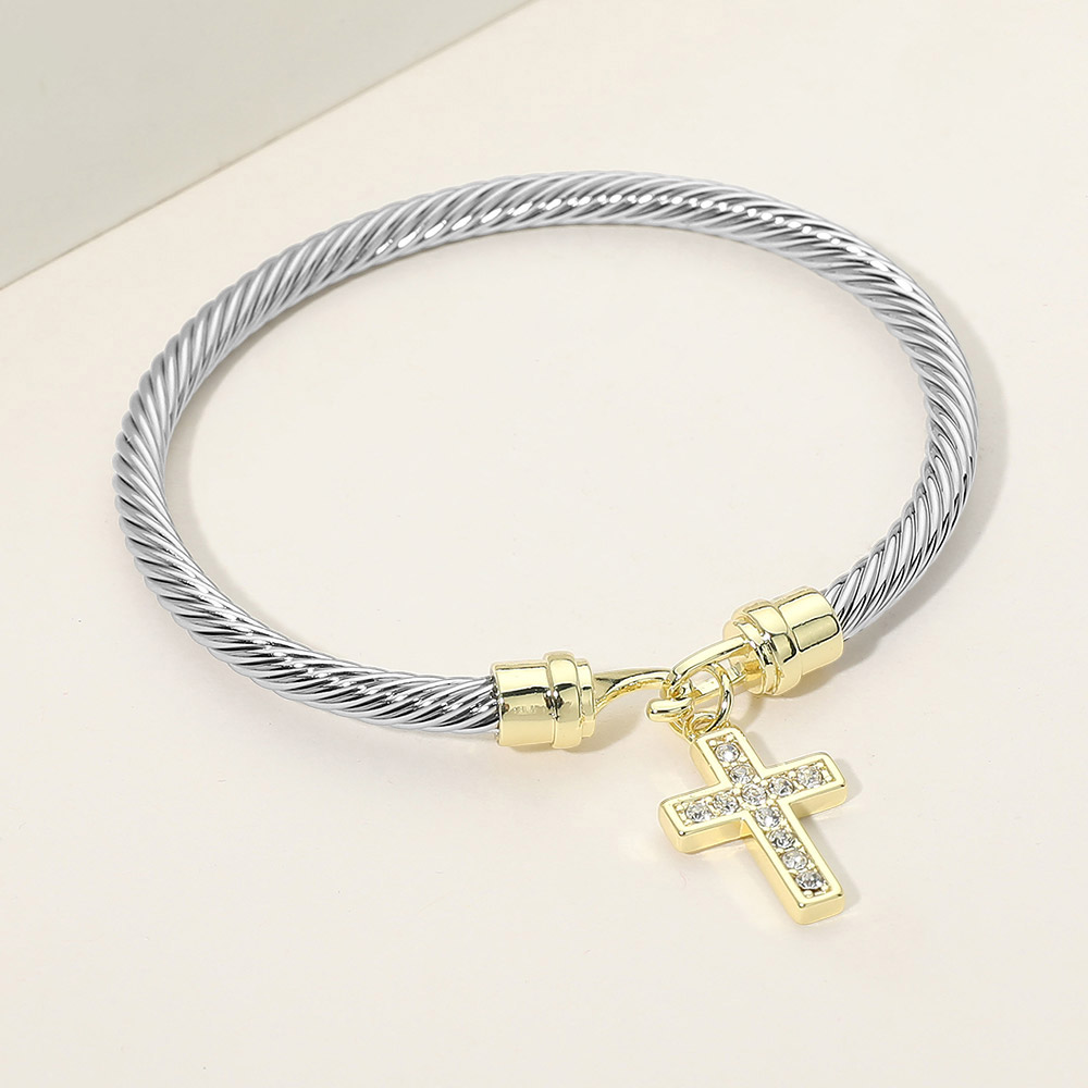 Two Tone CZ Pave Cross Charm Cable Bangle Bracelet Two Tone CZ Pave Cross Charm Cable Bangle Bracelet Two Tone CZ Pave Cross Charm Cable Bangle Bracelet