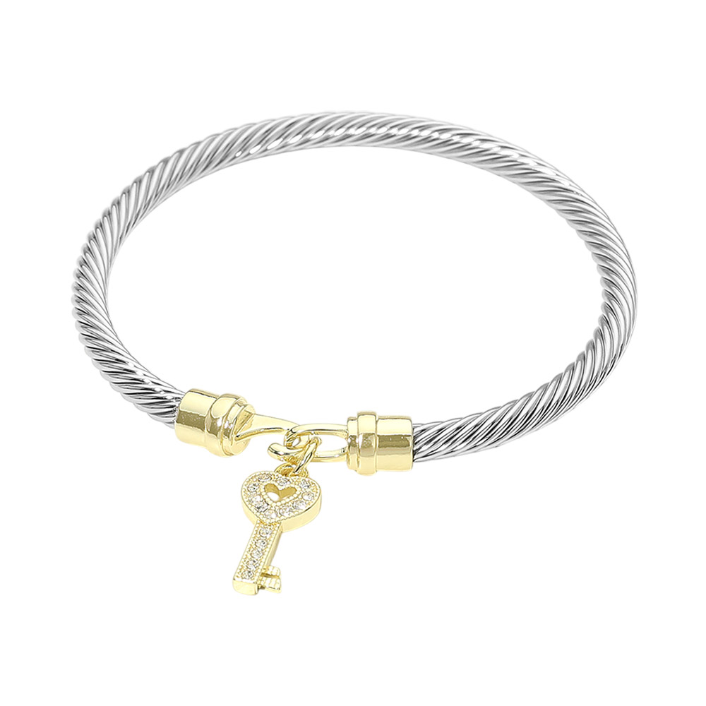 Details • Size : 0.2" H, 2.25" D • Charm Size : 0.5" L • Hook Closure • This key charm cable style bracelet features a sleek, structured design accented with a symbolic dangling key for a meaningful, stylish touch. Designed for everyday wear or special occasions, it offers a secure fit and timeless appeal, making it ideal for gifting, stacking, or boutique jewelry collections that focus on modern elegance. • CZ Cubic Zirconia
