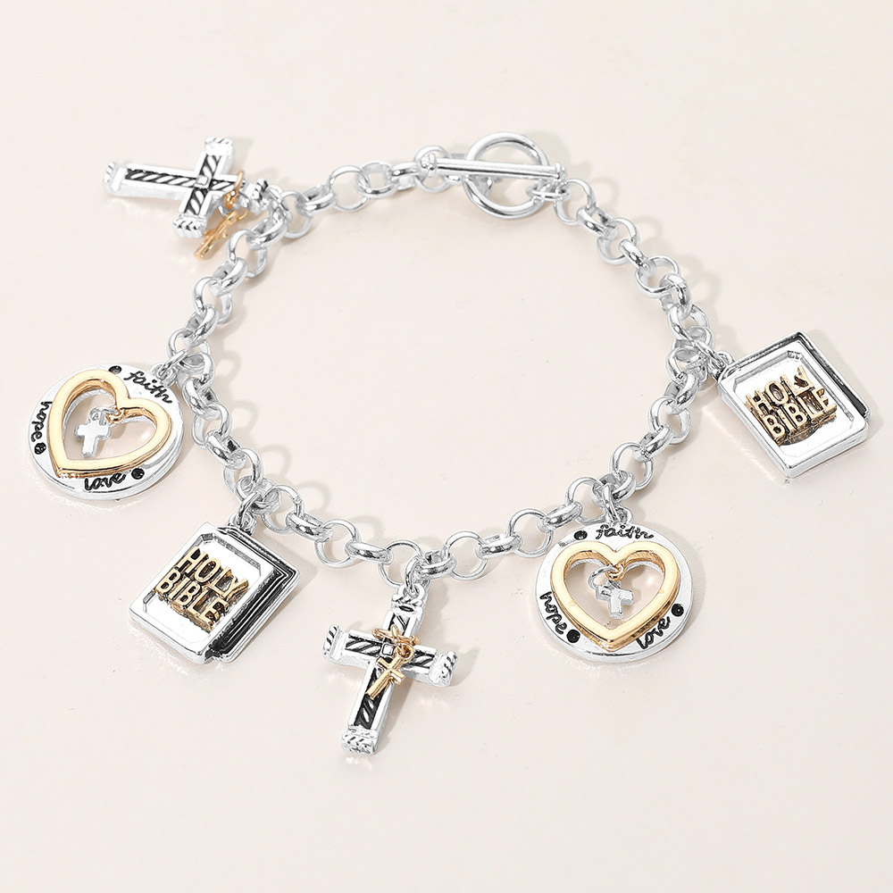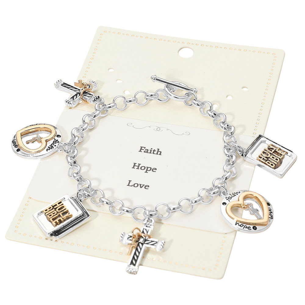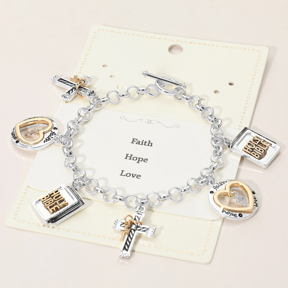 Details • Size : 1.2" H, 8" L • Toggle Closure • Showcase meaningful style with this charm link bracelet featuring messages of faith, hope, and love paired with symbolic accents. A thoughtful gift or daily wearable that blends sentimental design with versatile appeal for special occasions, celebrations, or heartfelt everyday expression. • Lead and Nickel Compliant