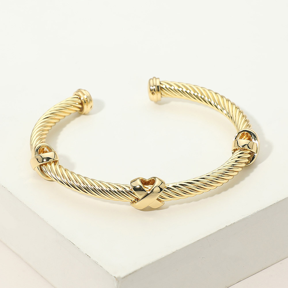Details • Size : 0.3" H, 2.3" D • Cuff • Elegant open cuff bracelet featuring a twisted cable design with a sculpted heart accent at the center. Designed for easy wear and everyday styling, this timeless cuff adds a refined touch to casual and elevated looks, making it a versatile choice for boutiques, gifting, and layered jewelry collections. • Gold Dipped