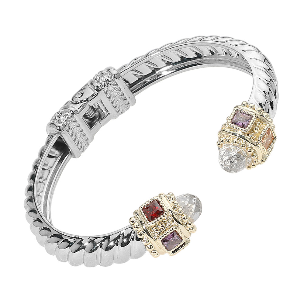 14K Gold Plated CZ Stone Tip Two Tone Twisted Hinge Cuff Bracelet