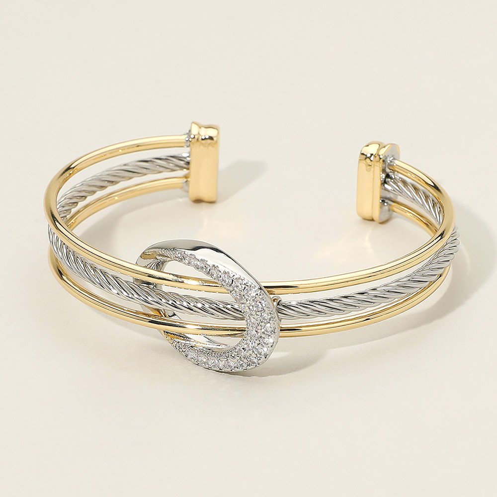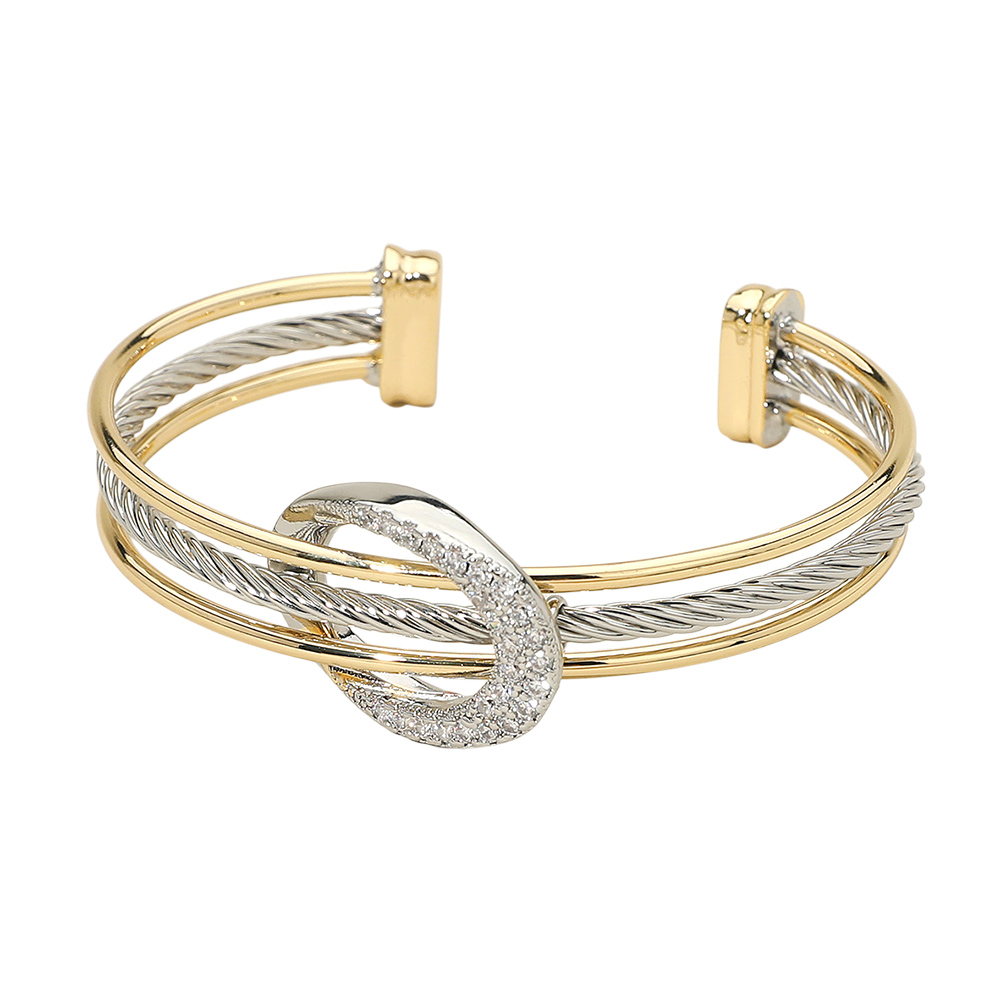 Details • Size : 0.8" H, 2.3" D • Cuff • Twisted Cuff Bracelet showcases an elegant open cuff design with intertwined detailing and a cz paved central accent for a refined look. Lightweight and comfortable, it slips on easily and pairs effortlessly with everyday outfits or formal wear for a polished finishing touch. • CZ Cubic Zirconia • Gold Dipped