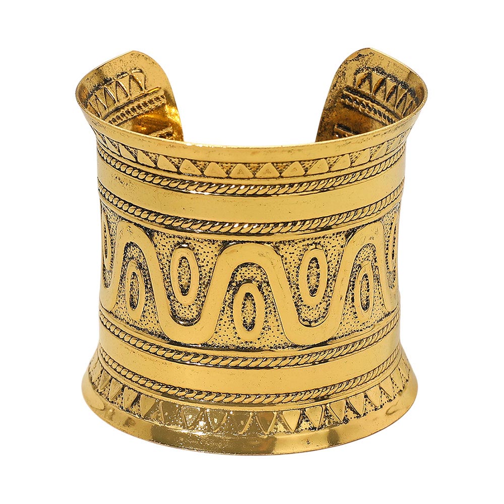 • Bold wide cuff bracelet featuring intricate tribal wave engravings and geometric borders for a striking artisan look. The sculpted open design offers an adjustable fit and adds a touch of vintage-inspired elegance to any outfit, perfect for both casual and statement styling.