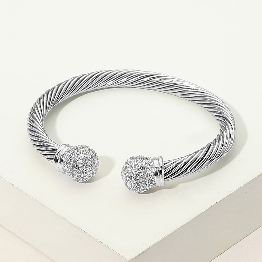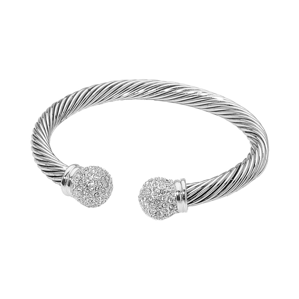 Details • Size : 0.5" H, 2.3" D • Cuff • Elegant open cuff bracelet featuring a sculpted twisted cable design finished with sparkling crystal ball end accents. Slip-on style offers comfort and flexibility while delivering a refined statement look. Perfect for stacking, gifting, or elevating everyday outfits in boutique and fashion-forward jewelry collections. • CZ Cubic Zirconia